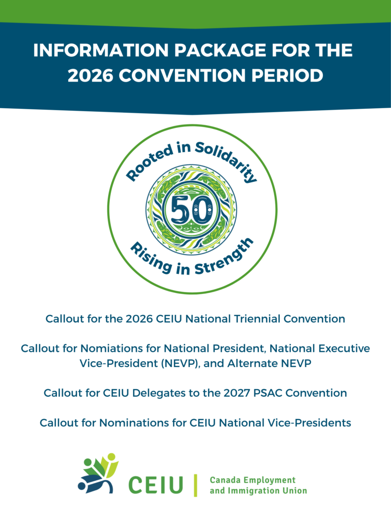 The 2026 CEIU National Triennial Convention will take place on the traditional ancestral, and unceded territories of the Musqueam, Squamish, and Tsleil-Waututh Nations, known today as Vancouver, British Columbia from September 14 to 18, 2026 under the theme ‘Rooted in Solidarity, Rising in Strength’.
